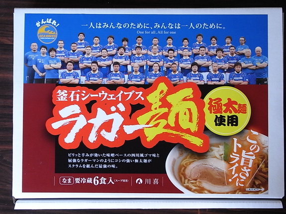 釜石名物釜石ラーメンとラグビーチーム「釜石シーウエーブス」がコラボしたラガー 麺。地元で大人気です。