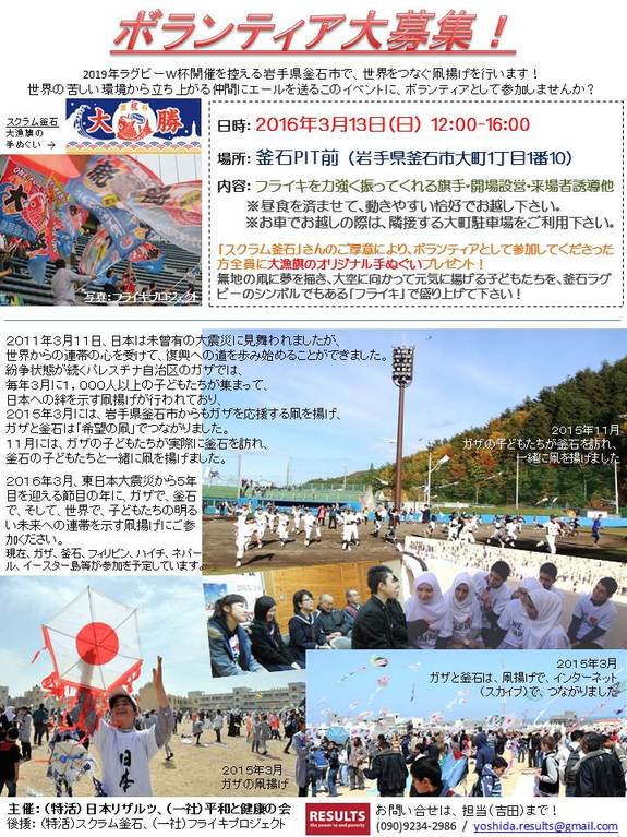さて、3月13日(日)に岩手県釜石市で行う凧揚げ大会にて、ボランティアを募集しています。
