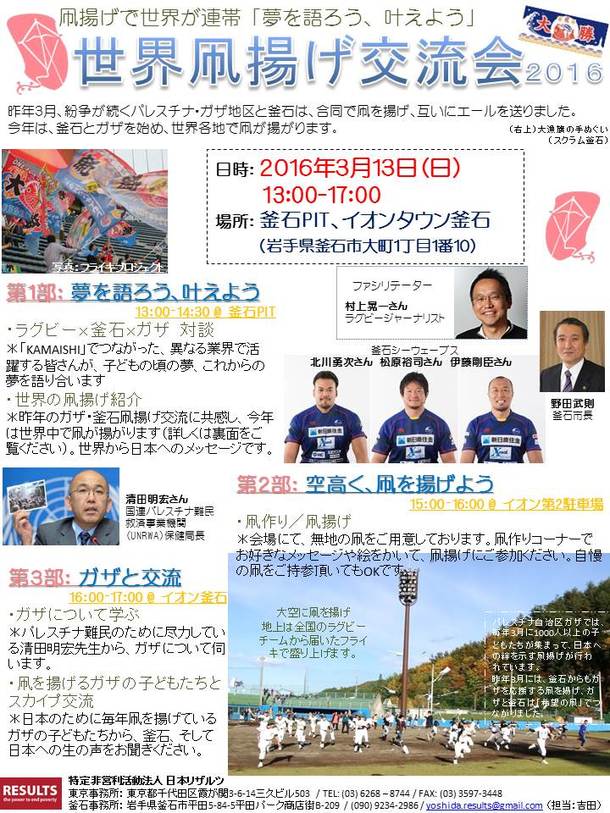 釜石では日本時間15時から凧を揚げ、その後、日本時間16時半(ガザ時間9時半)より、釜石とガザをスカイプでつないで交流を行います。