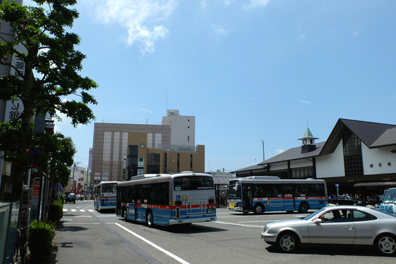 写真は鎌倉駅東口。場所は、左の奥に伸びている小径あたりです。