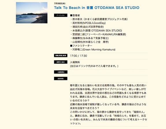 鎌倉の海についてのトークセッションですが、特に詳しいわけでもなく、またまだ本格的な活動を開始していませんが、地域全体で取り組むべき課題ということですので少しでもお役に立てばと思い参加させていただきます。よろしくお願いします。