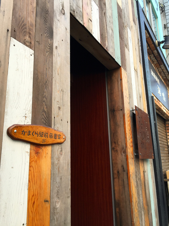 実は階段入口の囲みの板は、2階の立ち飲みビストロ「ランデブー・デザミ」さんがオープン時に製作されたもの。今回はオーナーさんの厚意で、そこに「かまくら駅前蔵書室」のネームプレートを取り付けさせていただきました。ありがとうございます。