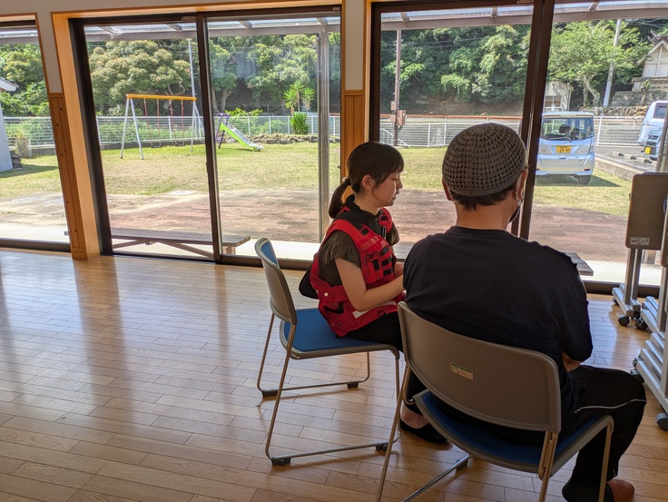 地域の方のご協力で、江ノ浜地区交流センターをお借りし、待合スペースとしました。
