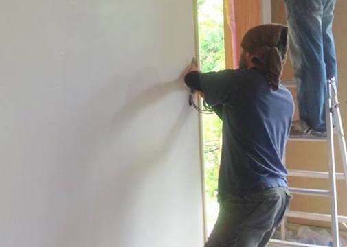 玄関柔らかな光を映す漆喰壁は、シェアハウスから移住したフランス人のヴァンくんによるもの。