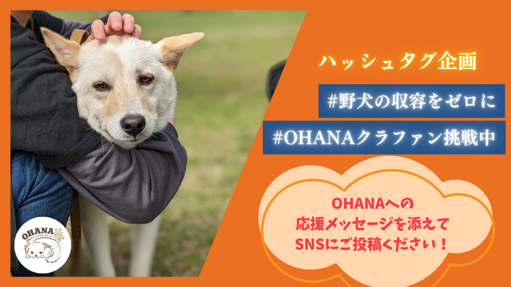 ●①ハッシュタグ「#野犬の収容をゼロに #OHANAクラファン挑戦中 」をつける
