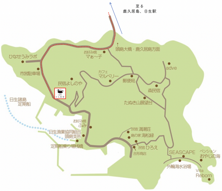 頭島の大通り沿いに行けば、すぐcafé かも食堂に着きます!