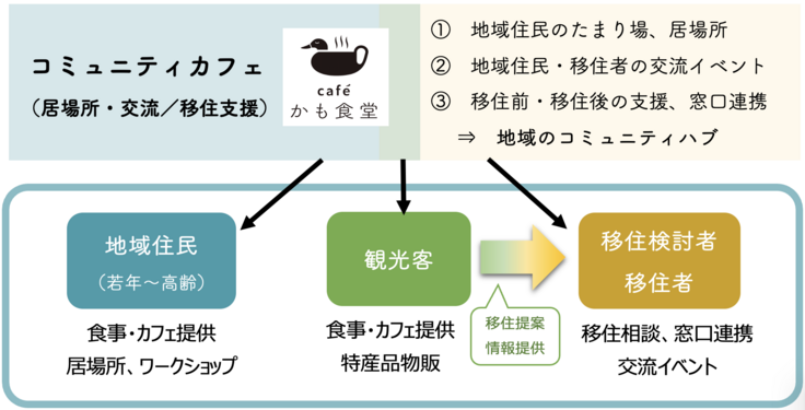 「café かも食堂」は通常のカフェ営業だけでなく、地域住民の居場所づくり、岡山県への移住者・移住検討者の交流の場(コミュニティカフェ)としての機能も持ち合わせています。