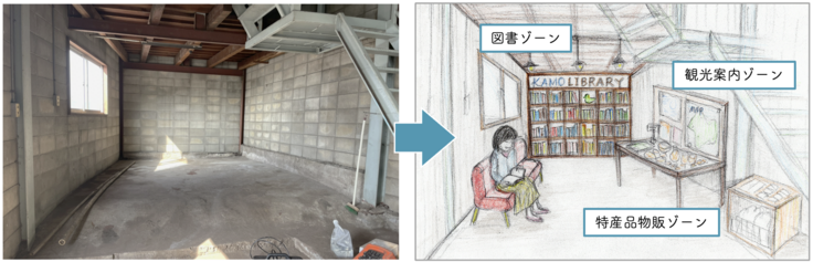 店舗に入って左側のエリアを、地域の方や観光客、移住検討者が、自由に図書に触れたりお話ししたり地域の魅力を発見したりできる「ワクワク促進ゾーン」にしたいと計画しています!