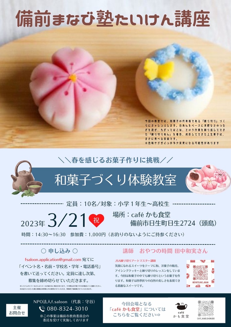 3/21にcaféかも食堂にて、備前市の学生さん向けに和菓子(ねりきり)づくり体験教室を行いました!