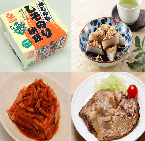 →おつけもの慶のキムチ・福来醤油・カジノヤ納豆・住吉の久寿餅・かもし堂の減塩塩糀漬け豚肩ロース肉(5品)