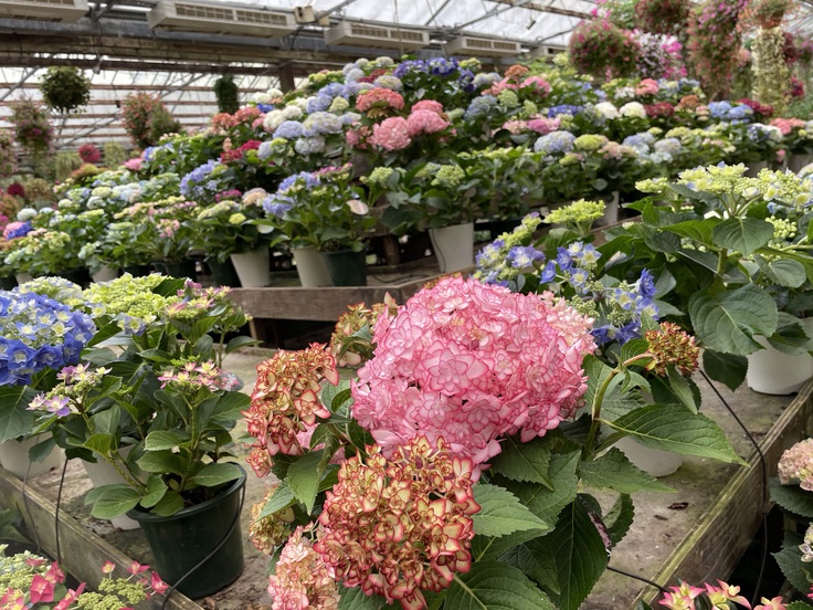 一方、展示温室内には約500鉢のアジサイが並ぶアジサイヒルズがございます。