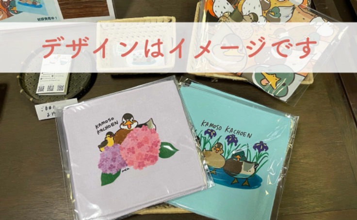 ※古寺、アジサイ、カモちゃんのイラストが書かれたオリジナルハンカチです