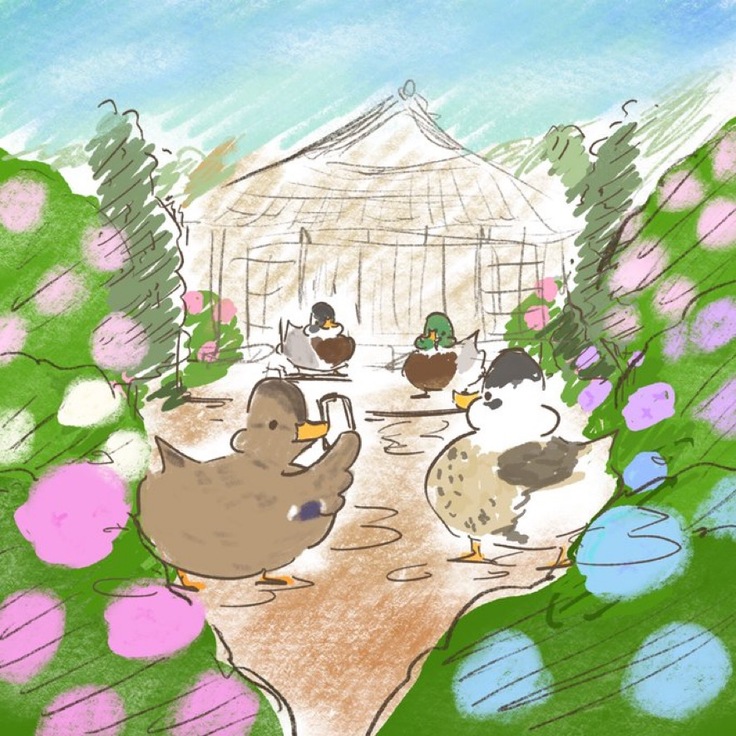 前回のカモちゃんたちが古寺を観光している絵にアジサイがたっぷり植えられて、とっても華やかになりました。 スマホで古寺の写真を撮るカモちゃんの後ろ姿がたまりません。