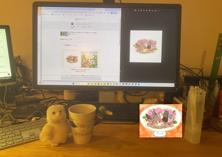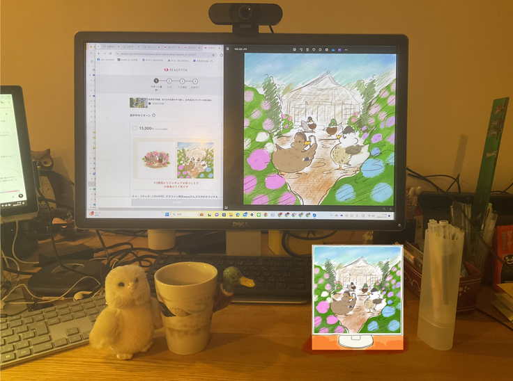 アクリルスタンドの現物はまだ届いておりませんので、社長自宅のデスク上に「クラファン限定mocaさんコラボのオリジナルアクリルスタンド」のイメージ図を描いてみました。横幅14㎝で、mocaさんのイラストそのものをスタンドにしています。今はラフ画ですが、完成品はそれはもちもちしていることでしょう。すぐ横は加茂愛用の無印良品のペンスタンドで、高さおよそ16㎝です。まだアクスタの現物が届いていないので、この合成写真(とまで言えるのか?)で想像していただけると嬉しいです。