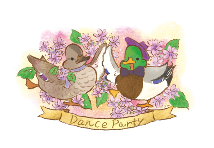 可愛いが溢れていて止まりませんね! ラフ画ではテマリ咲きのようだったアジサイがみごとにダンスパーティしてます。 蝶ネクタイとハットでおしゃれなかもちゃんも楽しそうです。