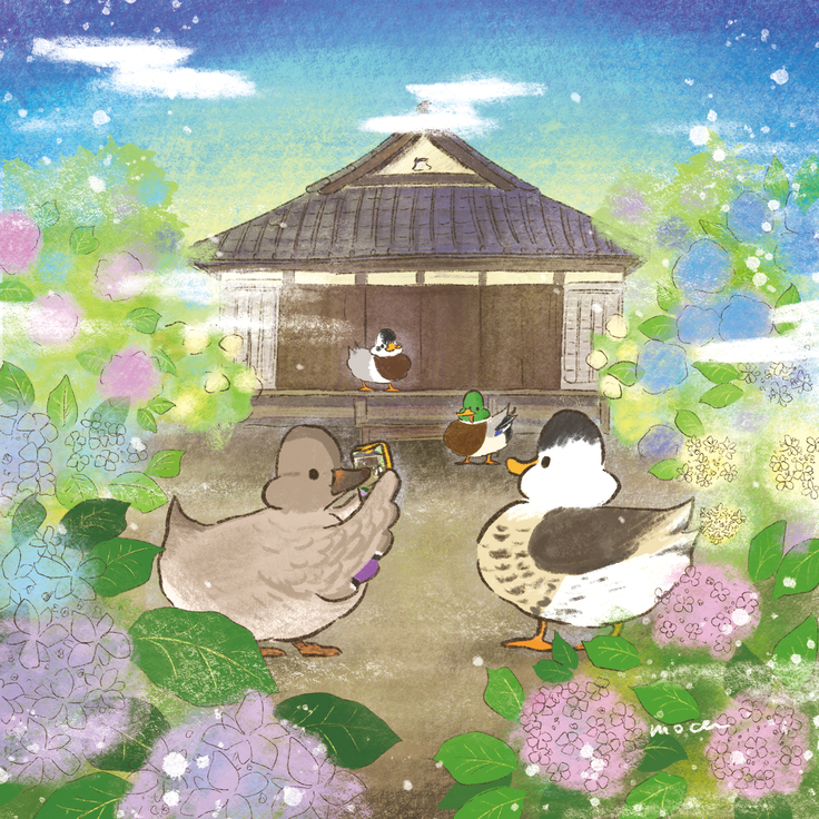 原木園と古寺を観光するかもちゃんたちです! なんだかとても幻想的で助けたカモに連れられて天界の古寺に案内されるような昔話が出来上がってしまいそうです⁉