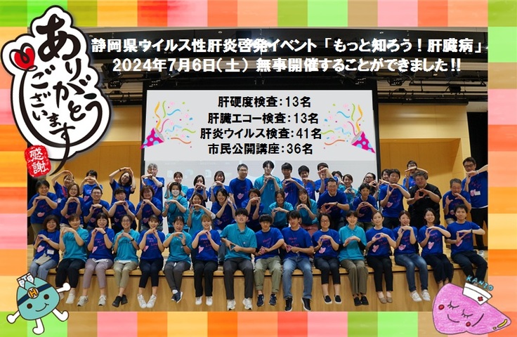 少しでも多くの市民の皆さんにウイルス性肝炎に興味を持ってもらい、ウイルス性肝炎を撲滅したいという私たちの思いが伝わるきっかけになったのではないかと思います。また、静岡県内の多くのスタッフと協力できたことは、今後の活動を考える上で強力なネットワークとなりました。今後も肝炎撲滅のため、関係者一同活動を続けてまいります。