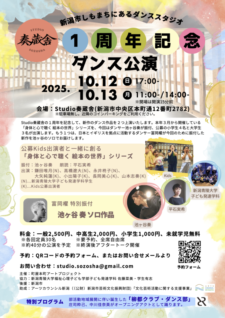 新潟市下町エリアにおける新たな文化芸術拠点として展開している「Studio奏蔵舎」。皆さまの応援によって活動ができております。今回の1周年では、子どもたちとの作品創作によって気軽にダンスやアートに触れられる機会を提供し、また子どもたちが本物のアートを観る・体験することができるような機会にしたいと思い企画してまいりました。ぜひ足をお運びいただけたらと思います。