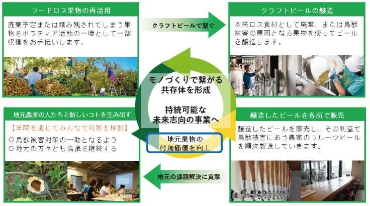 みかん、柿、くり、キウイフルーツなど、この地の大切な恵みをフードロスや鳥獣被害から新しいチャンスに変えていく試みについて、県や地元農家の方々が試行錯誤されていることから、ご地元の負担が少なく、受入れやすいカタチで、クラフトビールづくりを行い、地域の醸造家や神奈川の小売店と一丸とれる好循環な取り組みに成長させ、持続的な活動としていけることを目標として努力していきます。