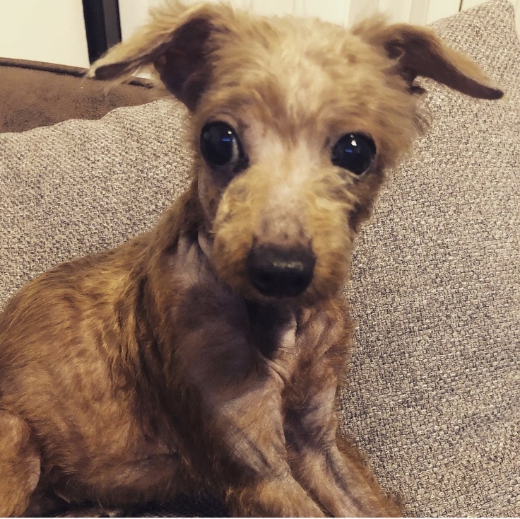私たちのところに来てくれたときの彼は、ストレスでガリガリ、毛が抜け落ち、とても不安そうな顔をしていました。