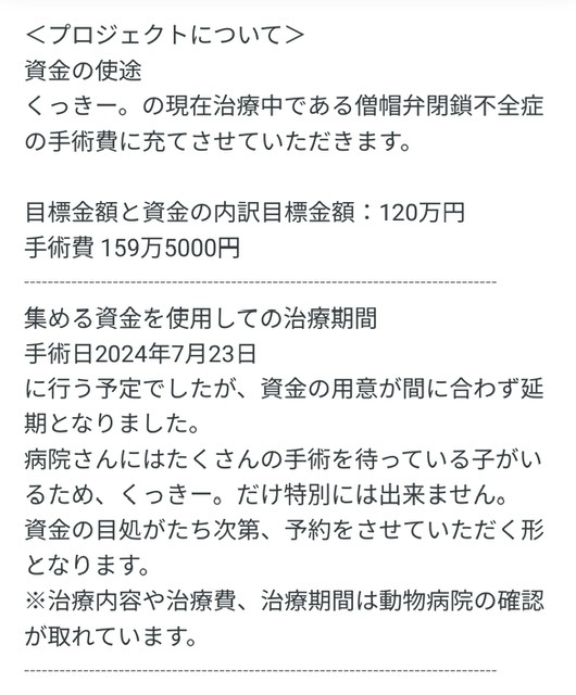 このクラウドファンディングがもしも達成できましたら、すぐにくっきー。の手術の予約をしたいと思っています。