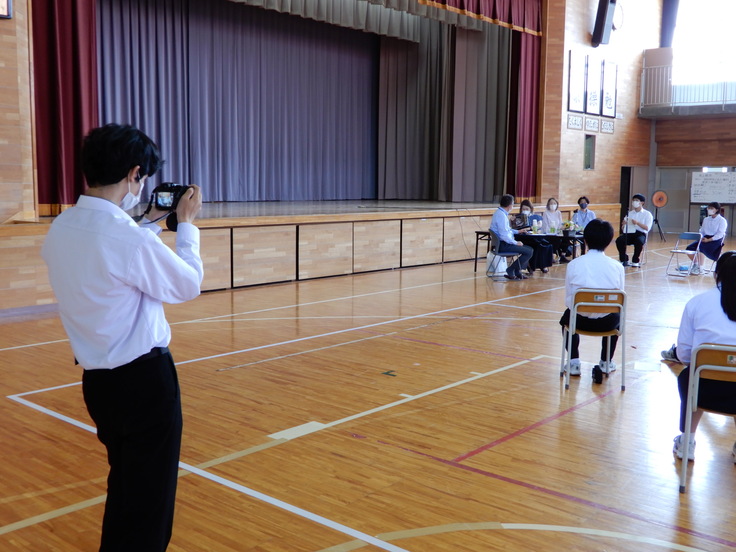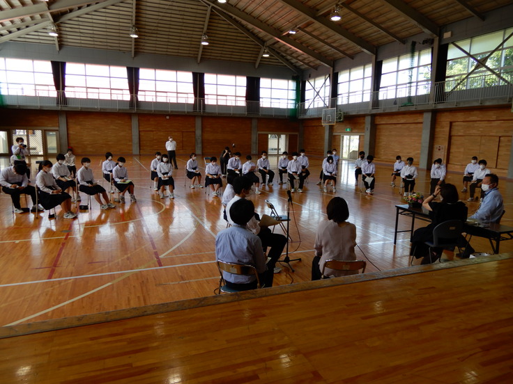 6月3日(木)に本校体育館で閉校記念誌プロジェクト,市長対談が行われました。黑須貫角田市長,そして東京でフリーライターとして活躍する齋藤あきこ様をお招きして,対談形式でのインタビューが行われました。お二人とも金津中学校の卒業生です。お二人の在学中の貴重なエピソードや,卒業してから現在の仕事に就かれるまでの体験談など,対談は和やかに進みました。インタビューのMCやカメラマン,録音担当も本校3年生が担いました。対談の最後にゲストのお二人は,3年生一人ひとりの将来の夢に耳を傾け,丁寧に助言をしてくださいました。対談の内容は,返礼品にもなっている閉校記念誌に収められます。