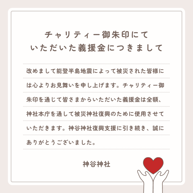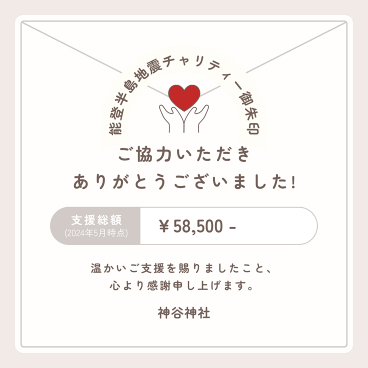 1月より頒布しておりました能登半島地震チャリティー御朱印ですが、5月中旬に締め切らせていただきました。