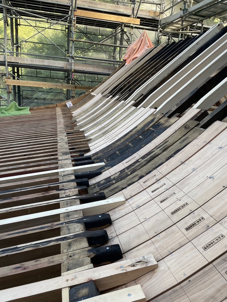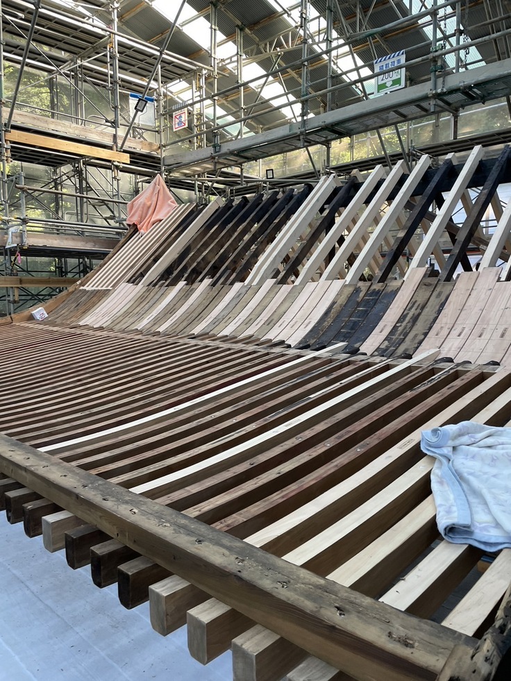 二重になった野地板の下の部分には鎌倉時代の当初材が使われていることがわかり、その部分は当初材を活かして使います。