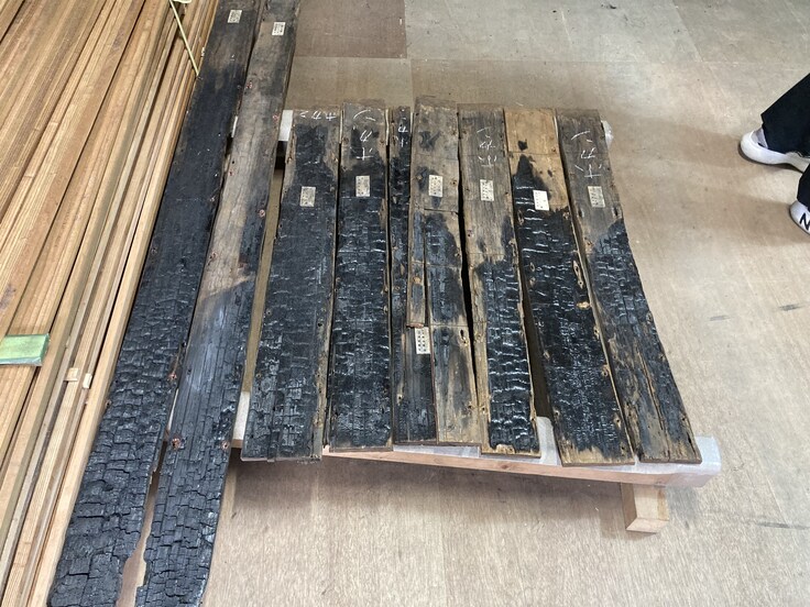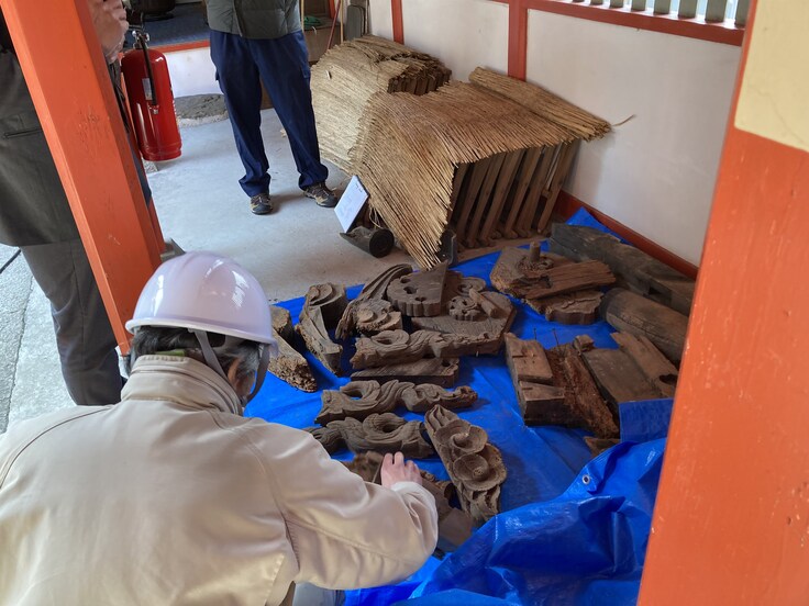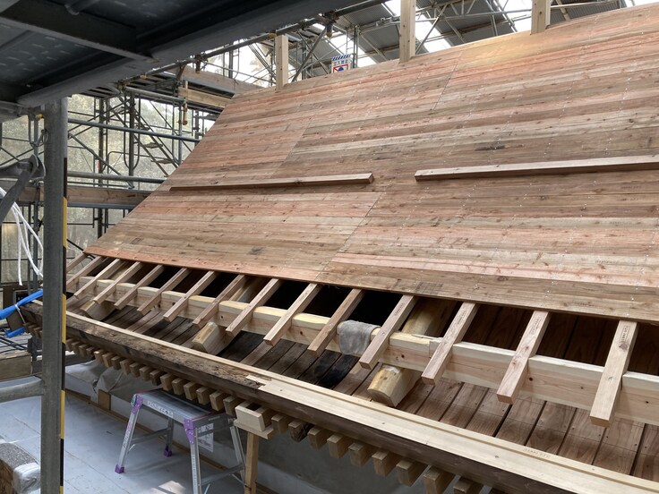現在、屋根の小屋組の復旧作業がほぼ終了し、この後いよいよ檜皮葺の準備に入ります。