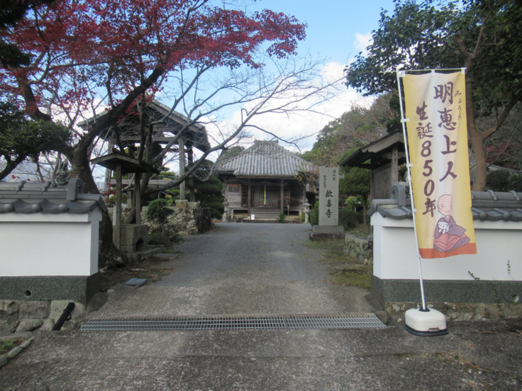 歓喜寺は寛和2年(986)恵心僧都源信が創建したと伝わる古刹です。鳥獣戯画で著名な世界遺産の京都高山寺を開いた明恵上人(みょうえしょうにん)の生誕地に隣接し、上人没後には弟子の喜海(きかい)が再興し、歓喜寺と名付けました。