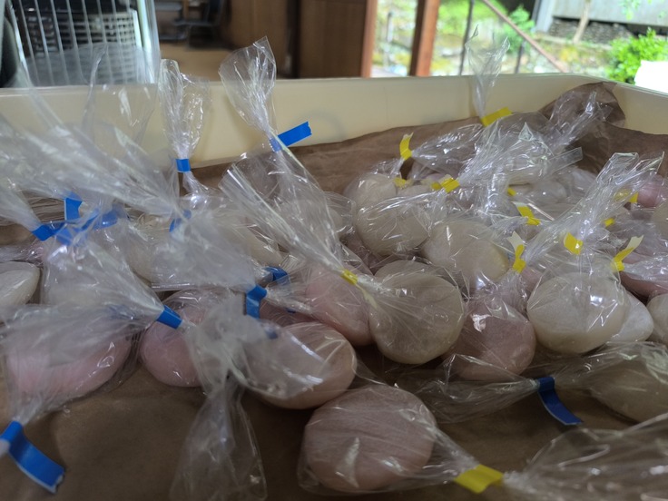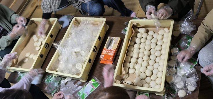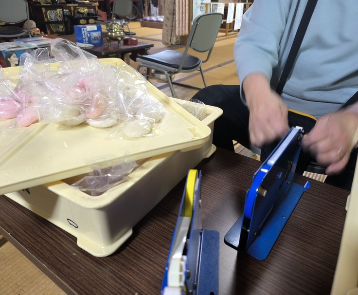 本堂ではお檀家さんとお餅投げのお餅を一つ一つ袋に詰めました。