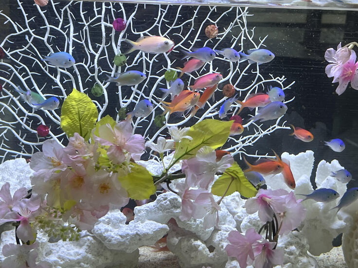 実は、この展示には桃の節句の祝いも込めて英名が「Peach fairy basslet」(桃の妖精)のアカネハナゴイを起用し、更にホワイトデーの時期も重なることからハナゴイのコイ(恋)にあやかり、桜で飾られたハートの装飾も前面に置き、「恋愛成就祈願」の水槽にもなっています。