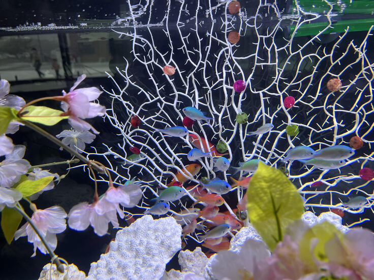 そして、青葉をイメージしたデバスズメダイ、、、実はこの種にそっくりなアオバスズメダイという種もいたりします。なぜこの魚?なぜこの飾り?色々考えながら観ていただくのも良いかもしれません。