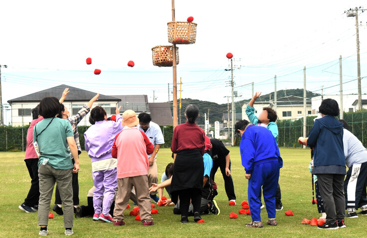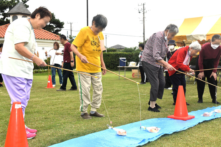 かにたの運動会は、競技ごとに一応順位は付けられますが、むきになって争うことはありません。もうとても走ることなどできない人でも勝てる可能性があるように種目を工夫しています。仲間には一生懸命声援を送り、職員が競技をする時には利用者さんが係を交代してくれたり、むしろ職員と競技をしたがる利用者さんもいたりと、和気あいあいとした雰囲気の中で進められます。