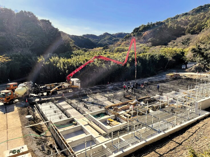 工事現場は、南側基礎の配筋工事が終わり、コンクリート打設が始まっています。