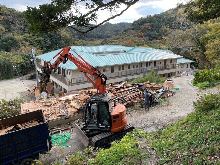 一方、国や自治体からの補助金も活用している関係上、旧施設のいくつかの建物を本年度中に解体・撤去しなければならず、現在は解体作業が急ピッチで進められています。撤去される建物の中には、居住棟だけではなく「日中活動」の施設もいくつか含まれています。