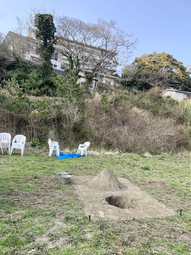 という訳で、農園の職員と利用者さんたちを中心に、さっそく定礎式のために地面を均し、穴を掘りました。(作業中の写真を撮れませんでした、、、)