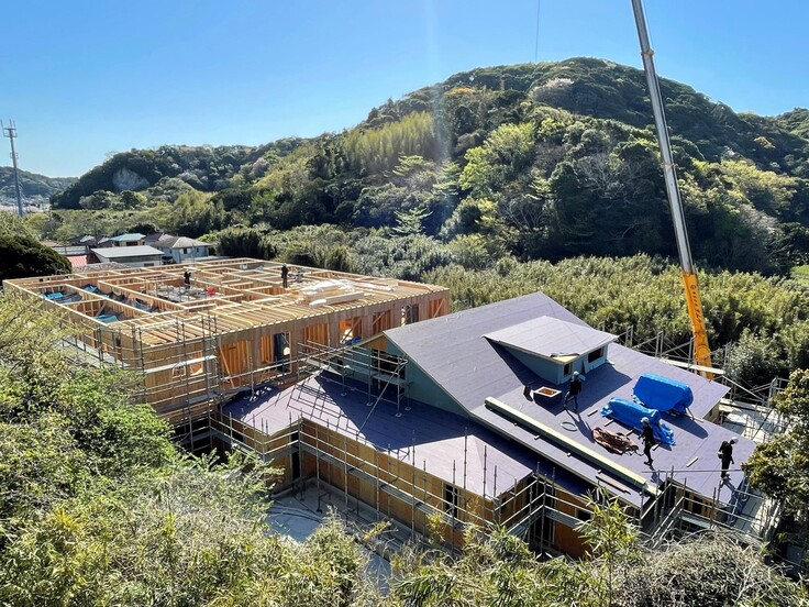2階建て部分は屋根の防水シートが張られました。