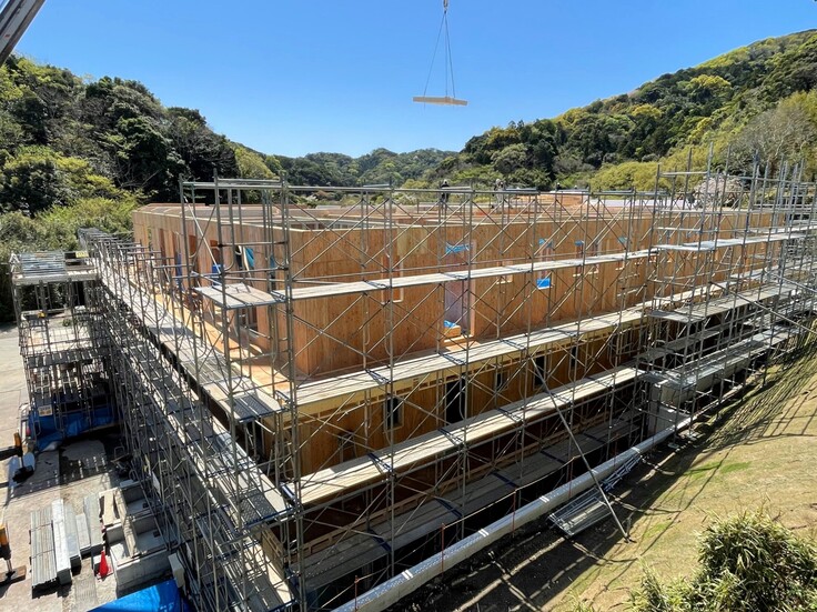 3階建て部分は壁パネルがすべて立ち上がり、天井の施工が始まっています。