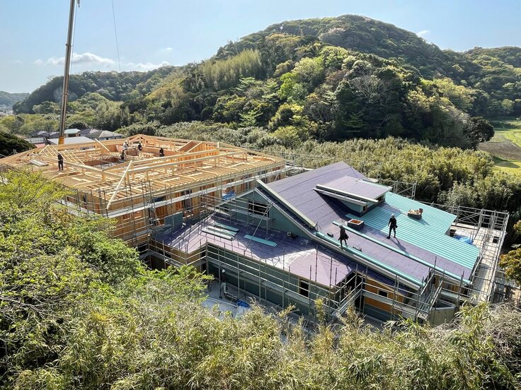 2階建て部分は屋根材のガルバリウム鋼板が張られ、3階建て部分は屋根が組み上げられています。