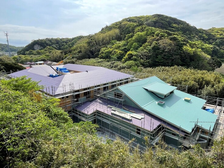 2階建部分は屋根材の施工が進み、3階建部分も屋根下地材に防水シートがほぼ貼られました。