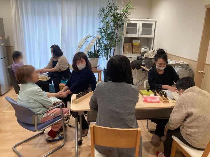 利用者さんたちは、初めての経験で緊張気味の方もいらっしゃいましたが、よい香りと気持ちのよいマッサージ、そして楽しくおしゃべりできて、会場はすぐに和やかな雰囲気に包まれました。