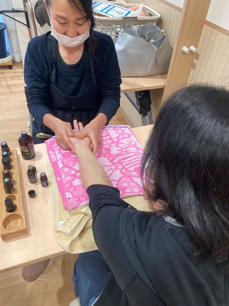 今日はセラピストさんたちがボランティアで来てくださり、ハンドマッサージの体験会をしてくださいました。