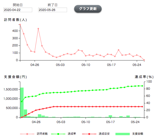 ここまでありがたいことに予想を超えるたくさんの方々からの応援をいただくことができました。下の画像はページ閲覧者数や目標達成率の推移を表したグラフです。
