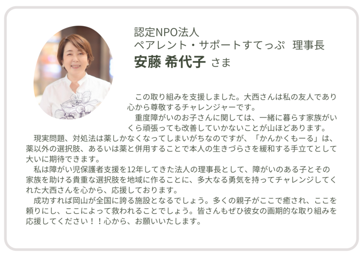 大切な友人であり仲間であり、姉のような存在でもある、認定NPO法人 ペアレント・サポートすてっぷ 理事長 安藤希代子さんより、応援のメッセージをいただきましたのでご紹介させていただきます。
