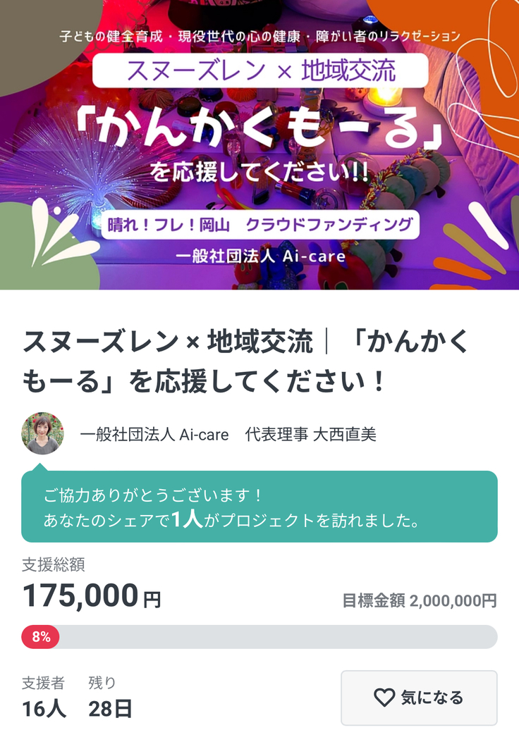 これまで 16名 の方から 合計 175,000円 のご支援をいただいております。