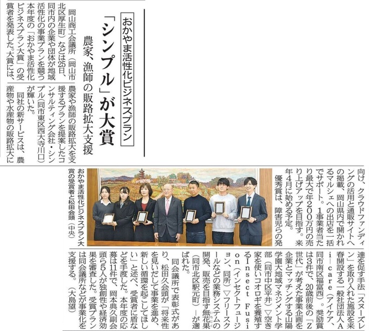 本日、2023年12月26日付 山陽新聞朝刊 6面 におきまして、昨日表彰いただきました「おかやま活性化ビジネスプラン大賞」についての記事をご掲載いただきました。