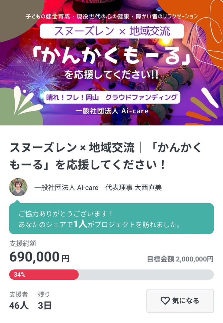 これまで 46名 の方から 合計 690,000円 のご支援をいただいております。