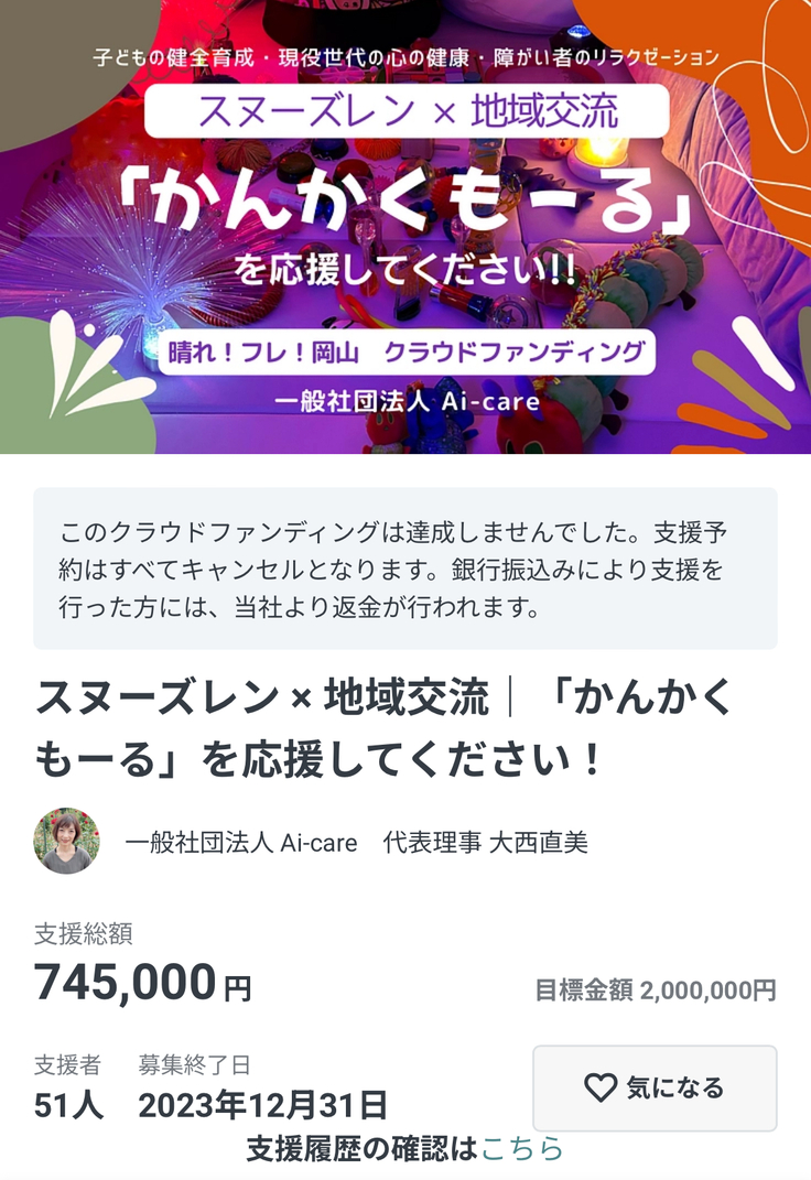 のべ 51名 の方から 合計 745,000円 のご支援をいただきましたが、残念ながら目標を達成することができませんでした。