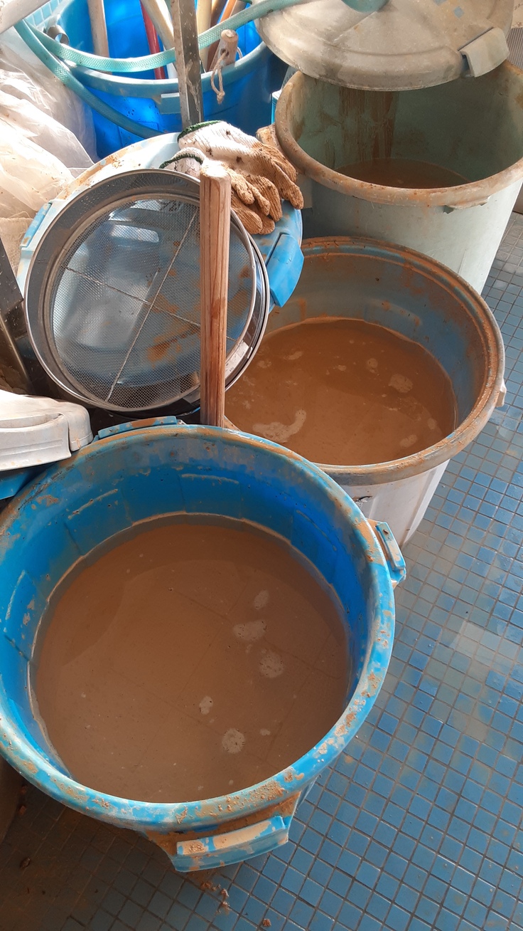 鹿野土原土のスイヒ(水に溶かして篩で濾す)をしました。